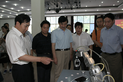 陕西省劳动和社会保障厅副厅长沙德宪(左三)、培训处处长雷云(左二)在学院院长李长江(右二)的陪同下观看学院预备技师毕业生制作的多功能机械手