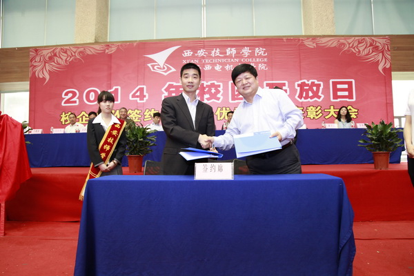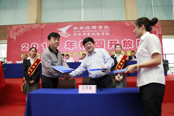 仪式上,李长江院长代表学院分别与陕西省电梯行业协会会长金宝签署《共建陕西电梯行业专业人才培训基地合作协议》、与西安腾润实业有限公司总经理董学宏签署《校企合作共建实训基地协议》。