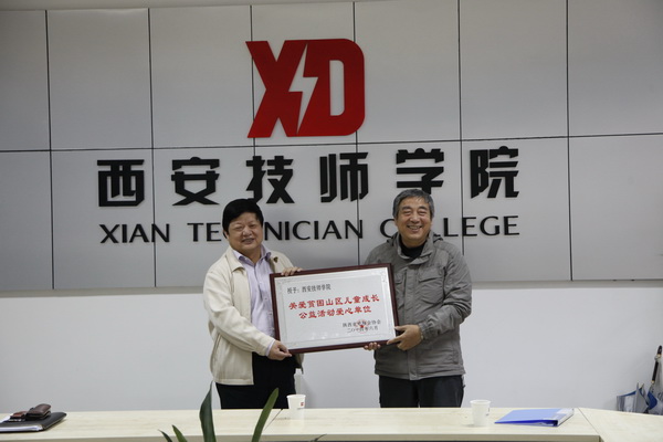 9月23日,天空还下着雨,陕西省电梯协会秘书长康威一行4人,来到学院,为学院送来了“爱心单位”牌匾。