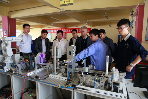院长李长江、副院长赵辉、院长助理冯小平及有关部系负责人陪同客人参观了学院的一体化教室、创意室、生产实训中心、图书吧等处场所,认真观看了预备技师的创意作品。