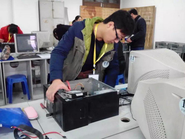 图为丁明景老师在比赛中进行计算机组装
