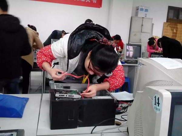 图为李佳老师在比赛中进行计算机组装