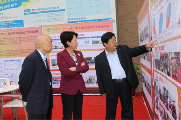 陕西省政协副主席、陕西省中华职业教育社主任李冬玉在观看学生作品