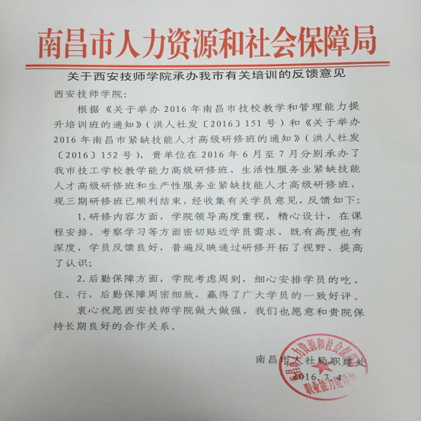 近日,西安技师学院收到了南昌市人社局职建处《关于西安技师学院承办我市有关培训的反馈意见》文件,对学院在培训研修内容、后勤保障等方面付出的努力及成果给予充分肯定。