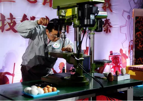 西安市钳工技术状元、西安技师学院教师王峰表演鸡蛋钻孔绝活