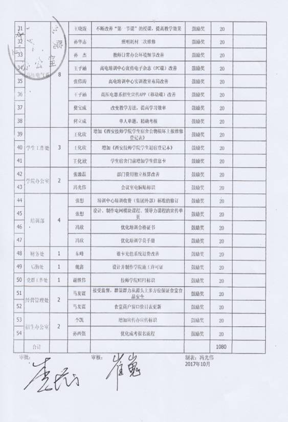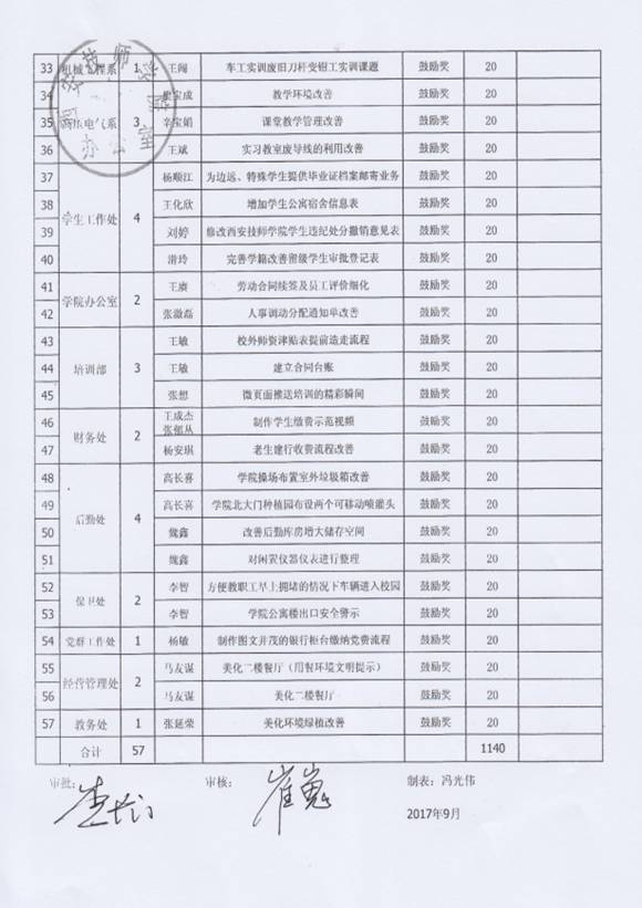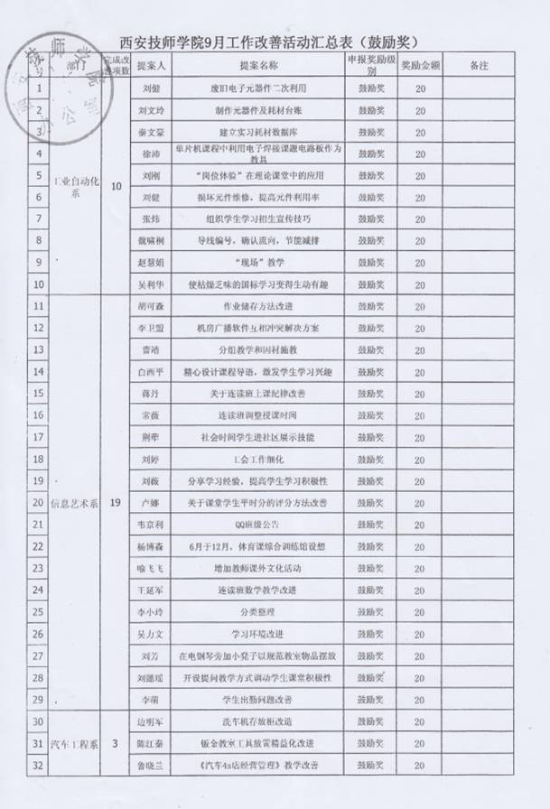 经过个人申报,部门及精益推进办审核后,11月6日,院长李长江对本年度9、10月份的教工精益改善“鼓励奖”进行了审批,并特别指出,机电技术系(原工业自动化系)已从原来的增加改善数量转变为现在的提高改善提案质量,从“量”到“质”的改变本身就是大的改善,给予了很高的评价。现代服务系(原信息艺术系)提倡全员参与,系部的每一位老师都参与到精益改善当中。