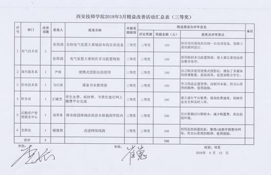 2018年3月,经过个人申报,部门及精益推进办审核后,学院共发出奖励58个,其中三等奖7个,鼓励奖51个。
