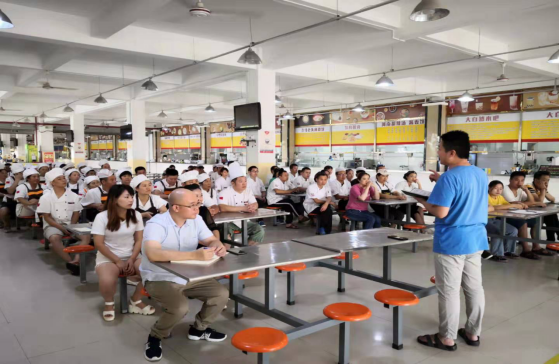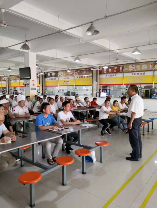 2019年8月30日下午,技师学院后勤中心组织食堂、超市参与食品安全的从业人员进行新学期及秋季食品安全管理知识培训。此次培训由高常喜老师主持,各餐饮公司、超市负责人和从业人员以及后勤中心相关管理人员80余人参会。