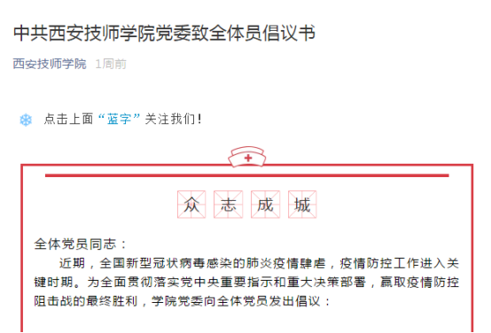 全员参与,确保实效。学院各部门紧密配合,共同做好防疫工作。后勤管理服务中心第一时间拟定防控应急预案,采购所需防疫物资,组织人员对校园各区域进行全面清理消毒;学生管理服务中心保卫科加强校园防疫巡查,禁止校外人员进入学校,对校内人员进出进行严格登记和体温检测;各部门通过工作群、家长群、班级群等方式开展健康教育,向全体师生和家长宣传普及疫情防治知识和防控要点,指导师生和家长居家外出时做好防控,尽量减少前往通风不畅和人流密集场所;党群纪检处通过微信公众号、校园网等途径及时向师生宣传中央决策部署、疫情防控知识、《西安技师学院防控新型冠状病毒肺炎疫情致全体师生及家长的倡议书》、《西安技师学院党委致全体党员倡议书》等,做到人人知晓,提高师生健康意识和自我保护能力;教务处及学生管理服务中心按照要求发布延期开学通知,组织各系做好推迟开学的各项准备工作,保证停课不停学。