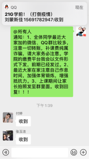 疫情爆发初期,给大众造成一定程度的心理冲击。面对社会上的一些谣言,班主任老师们以敏锐的政治嗅觉,在班级群积极给学生开展思想教育和心理疏导工作,帮助学生了解事实、学习科普新冠肺炎知识,消除恐慌、焦躁情绪,要求学生做到“不造谣、不信谣、不传谣”,找准政治站位,保持与党中央和国家的一致,坚定必胜的信心,极大地稳定了学生的思想意识。