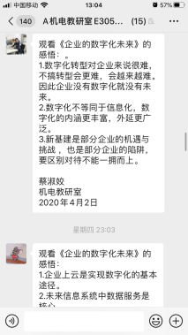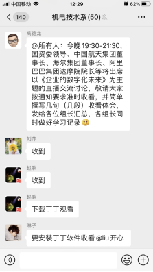 为贯彻习近平总书记在统筹推进新冠肺炎疫情防控和经济社会发展工作部署会议上的重要讲话精神,全面落实党中央、国务院决策部署,精准有序推动复工复产,全力以赴完成全年目标任务,加快企业数字化智能化转型,增强教职工打赢新冠肺炎疫情阻击战的信心和决心,4月2日晚上19.30,西安技师学院机电技术系组织全体教师通过钉钉APP载体,收看由国务院国资委教育培训中心和中国企业联合会共同举办以《企业的数字化未来》为主题的企业家高端对话网络直播活动,并就自身学习情况做好观看笔记和学习感想。