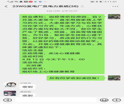因疫情防控原因,学生自2月底至今一直采用居家线上学习的方式。鉴于学生居家学习与在校学习在学习方式、生活方式、心理状况等方面均有较大不同,部分学生产生了焦虑、烦躁、沮丧等情绪困扰。学生管理服务中心密切关注学生心理健康,于4月8日-4月14日期间,组织全体学生开展主题为“正视情绪,关注心理健康”的线上心理健康疏导工作。