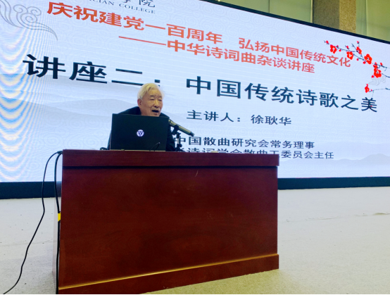 学院邀请中国散曲研究会常务理事、中华诗词学会散曲工委员会主任徐耿华先生和原西安职业技术学院机电学院院长、现任中华诗词学会常务理事、陕西省散曲学会会长、陕西省诗词学会副会长、《中华散曲》主编李稳贤先生主讲。