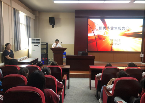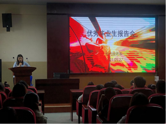 5月27日下午15:00,现代服务系在C-302召开了优秀毕业生报告会。报告会由现代服务系主任王楠主持,18G财管刘梦竹、19G财管于文浩2名优秀毕业生给服务系的同学们分享了各自上学时的学习方法、心得及走向职场后的工作经历。