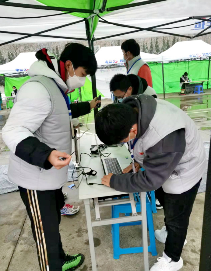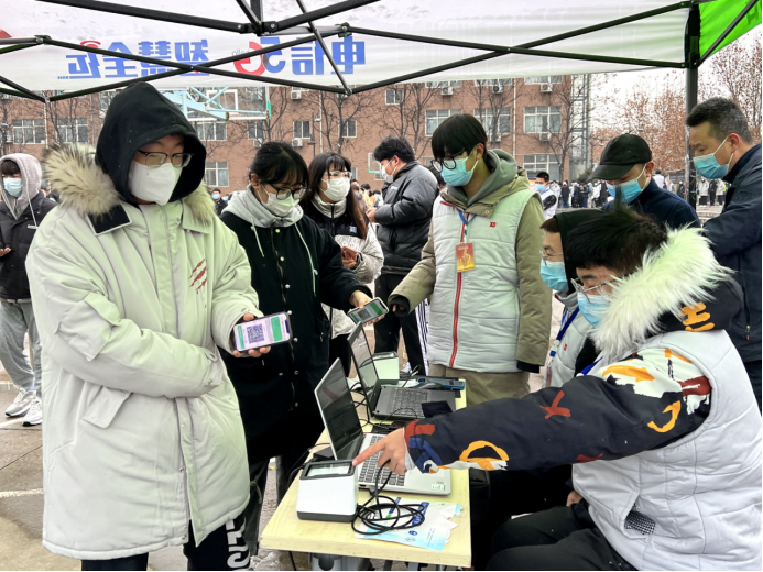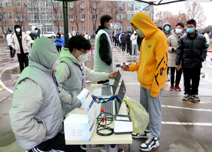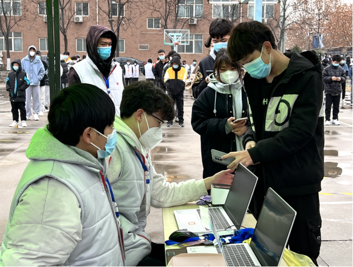 上午,学生志愿者们就开始动手搭设核酸检测棚,调试扫码测温区设备,为核酸检测顺利开始做好基础准备工作。