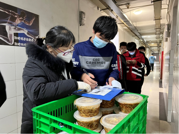 为减少人员流动,12月28日起,学院餐厅禁止堂食。针对以上现状,学院快速对疫情防控组织机构和工作专班进行调整,成立了学生及楼宇管理专班,由院长助理、党群纪检处处长姚永乐、现代服务系主任王楠、电气技术系主任徐晓英、副主任门新会、机电技术系副主任高德龙及留守学校的45名教师组成,主要负责宿舍楼宇巡查、督促学生开展线上学习、统计学生餐食数量、组织发放餐食、帮助学生解决各种困难、做好学生心理疏导、组织学生进行核酸检测、开展线上各类活动等工作。
