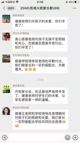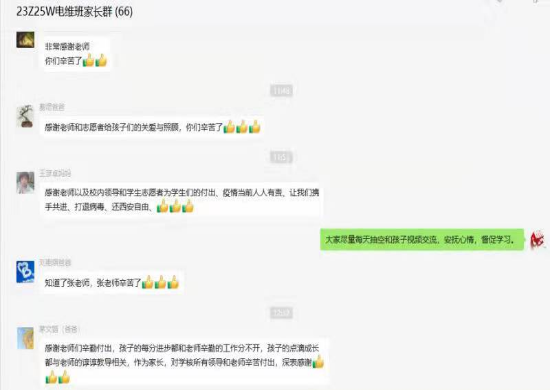 23Z25W电维班付江旭家长说,“看到西安技师学院经过近十轮核酸筛查无一例阳性的结果,真让人暖心+感动,舒畅+激动!当然这费心费力来之不易的结果离不开学院所有辛勤的老师们和冲锋一线的志愿者们坚韧的付出,我代表家人感谢你们,你们为‘平安学院,学院平安’辛苦了!愿我们的西安平安顺遂,我们的祖国繁荣昌盛!”
