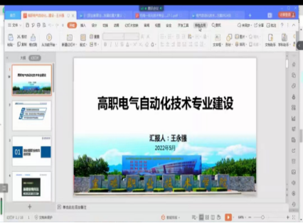5月7日晚,电气技术系邀请到专家组的王永强副教授通过腾讯会议为电气技术系教师带来《高职电气自动化技术专业》专业建设的讲座。王永强副教授来自省级示范性高职院校,是电气自动化技术专业带头人、教学能手,拥有极强的专业性和教学经验。本次讲座中王教授重点对机电一体化技术高水平专业群建设的依据和建设方案进行了说明,并对电气自动化技术专业建设基础、专业建设思路、专业人才培养方案修订依据、过程及结果进行了详细的讲解。