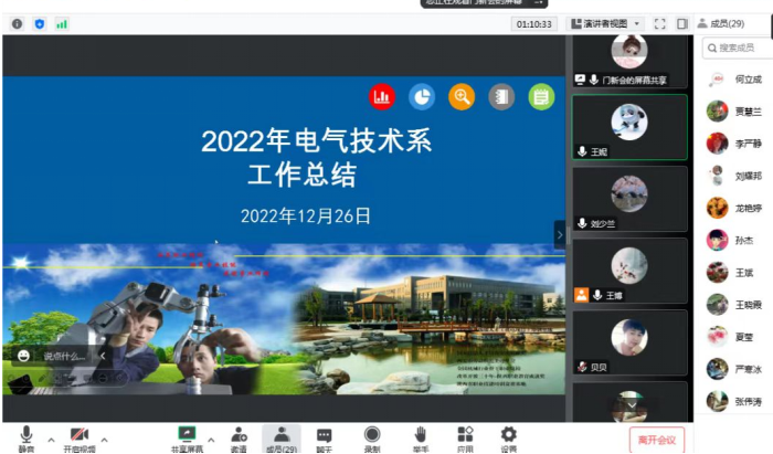为全面总结电气技术系2022年度各项工作,扎实推动电气技术系2023年各项工作全面起势、有序推进,2022年12月26日,电气技术系组织召开期末工作总结大会。会议由门新会副主任主持,电气技术系全体教职工参加线上会议。