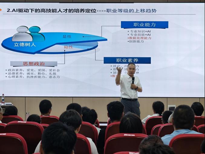 为深入贯彻落实党的二十大关于教育科技人才一体发展战略部署,主动融入新一轮科技革命和产业变革浪潮,学院以教研教改为突破口,系统谋划新时代高技能人才培养新模式。日前,学院党委书记、院长冯小平以“AI技术驱动下的高技能人才培养定位与策略”为主题,为全校教师作专题讲座,系统阐释职业教育数字化转型新路径。