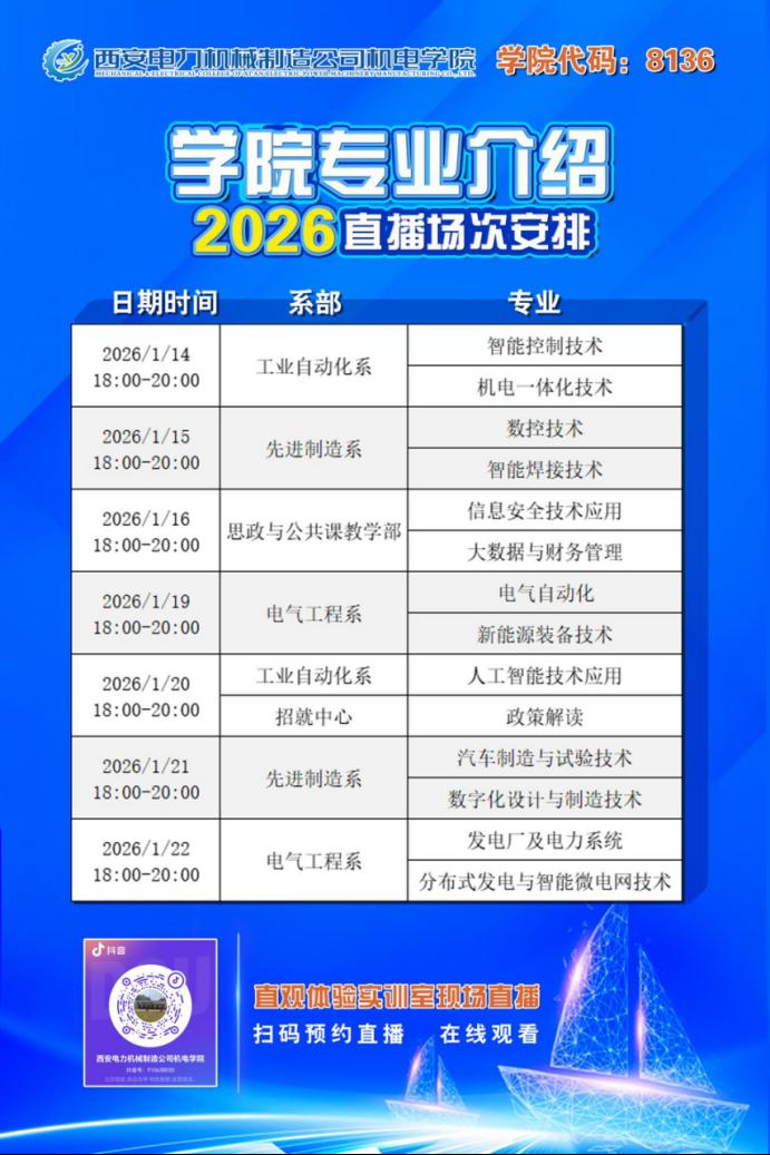 分类招生选对专业,升学就业少走弯路!1月14日起,锁定学院抖音直播间,搞定分类招生所有疑问,转发海报给身边备考的同学,一起抢占升学名额!