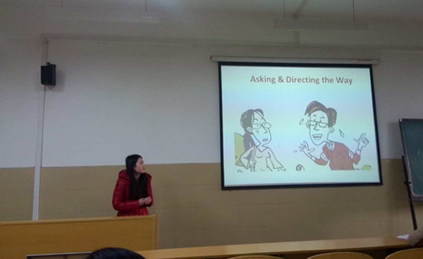 蒋丹老师在讲“Asking & Directing the Way”,结合职业院校学生特点,蒋老师制作了精美的课件,详细讲解了学生在口语交际中经常出现的问题,使学生在短短的几分钟里全面掌握了问路和指路的口语交流。